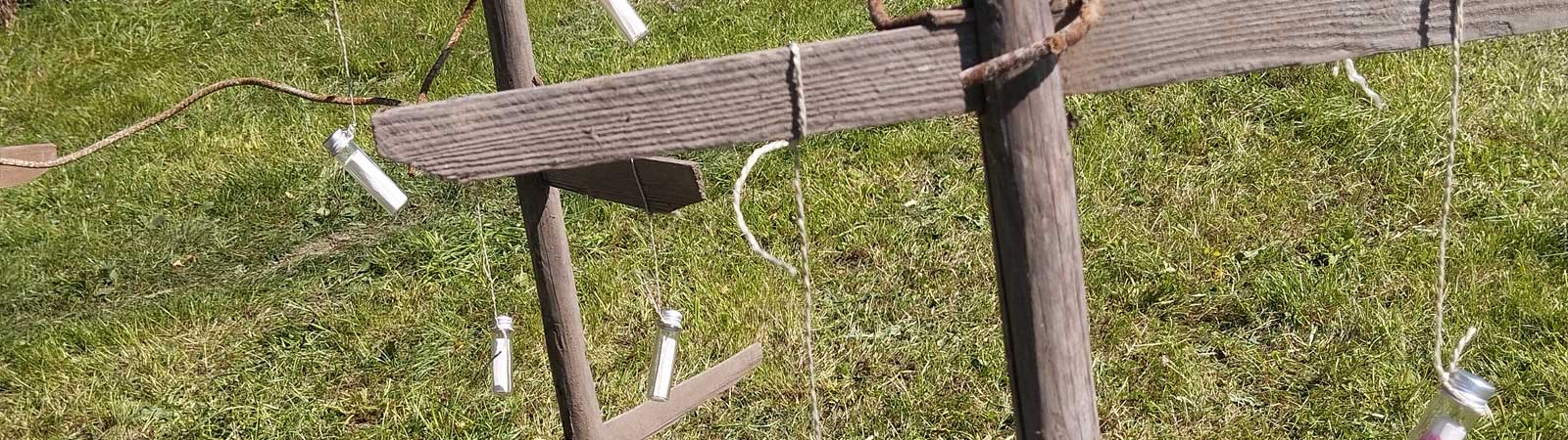 Wunschbäume kommen an die Rothach Scheffau/Thal. 2023 fand der Sommerworkshop mit dem Titel "Bindestrich" unter der Leitung des Wuppertaler Künstlers Otto Zech, erfolgreich in den Rothachtalgemeinden Scheffau und Thal statt. Initiator war traditionell der Förderkreis Kunst- und Kulturprojekt Rothachtal, dessen Anliegen es ist mit den Mitteln der Kunst Brückenbauer im Grenzgebiet Allgäu/Vorarlberg zu sein. Drei Tage konnten Künstlerinnen und Künstler Werke erarbeiten, alleine und in der Gemeinschaft. Der Workshop fand in Scheffau und Thal statt und zog täglich zwischen 40 und 50 vorwiegend Kinder an, die mit viel Freude ans Werk gingen. Zusammen mit Otto Zech gestalteten sie "Wunschbäume": landschaftstypische Huizen, denen in kleinen Glasröhrchen eingerollte Wunschzettel angehangen wurden. Dass der Krieg aufhören möge, der Opa gesund werde....bis hin zum neuen Fahrrad wurde alles untergebracht. Die meisten Wünsche jedoch wurden in Stille aufgehangen. Otto Zech installierte diese zusammen mit den Kindern in den jeweiligen Dorfkernen. Am 16.8.2023 wurden die Wunschbäume mit den unsichtbaren Wünschen der Kinder des Sommerworkshops aus Thal und Scheffau zu einem sichtbaren Bindestrich an der Rothach zusammen gefügt.